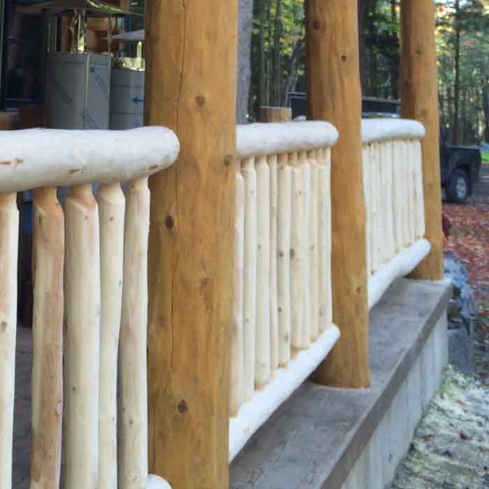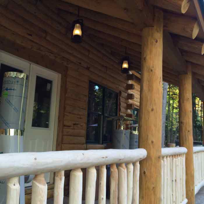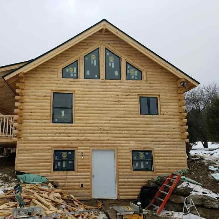 The top part of the house is tradition stacked logs, while the basement section is white cedar log siding to match the rest of the home. The full length porch has exposed rafters and beautiful banisters. A walk out basement, metal roof, and those peaked windows really add to the look.
