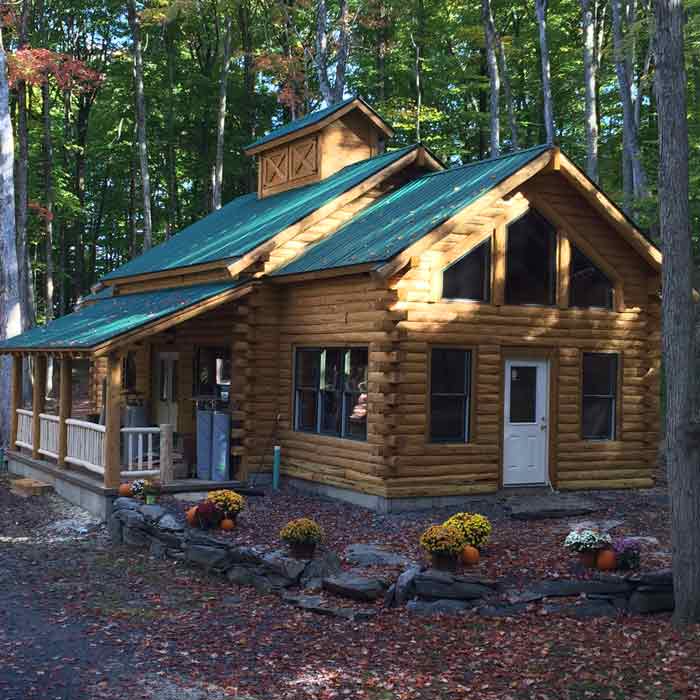 This was a kit from Authentic Log Homes out of Hardwick, Vt. The green metal roof and the flower beds really add something special to this home away from home.